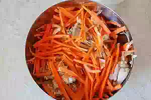 4. Лук очистить и порубить полукольцами. Морковь вымыть, очистить и порезать соломкой (или натереть на терке для корейской моркови). Чеснок почистить, нарезать дольки лепестками.