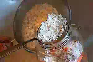 7. Поверх мяса с овощами насыпать рис. Немного присолить. Банка должна быть наполнена не более чем на 2/3 своего объема. Налить питьевой воды, чтобы она почти доходила до уровня риса. Помним, что мясо с овощами еще даст сок, и жидкости в банке станет больше.