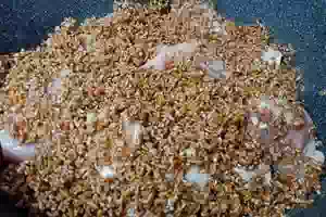 3. Поверх курицы высыпаем полбу. Солим по вкусу.