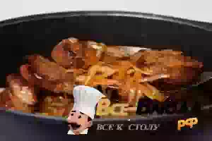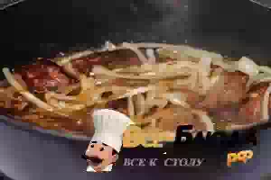 5. Опустить мясо в масло на дно чугунка. Обжаривать до появления коричневой корочки. Затем, добавить лук, щепотку тмина, 1/2 соли и черного молотого перца. Все хорошо перемешать.
