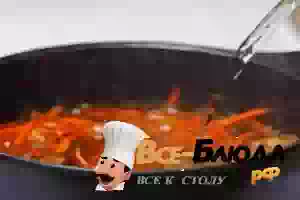 7. Выложить морковь в чугунок. Добавить остатки соли и тмина. Перемешать и готовить до "размягчения" морковки. Помешивайте каждые 30 сек. Залить 8 чашек кипяченой воды.