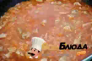 4. Свинину режем небольшими кусочками, выкладываем в сковороду к овощам, хорошо перемешиваем. Накрываем сковороду крышкой и тушим 15-20 минут, периодически перемешивая.