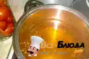 6. Через пятнадцать минут в кастрюлю сливаем воду из банки, добавляем продукты для маринада. Даём прокипеть пару минут раствору соли и сахара, чтобы кристаллы полностью растворились. Вливаем уксус и снимаем с огня. Уксус быстро испаряется, поэтому кипеть маринаду долго не надо. Кипящим маринадом заливаем помидоры с базиликом и герметично закатываем крышками. Банки укутать в плед до полного остывания, предварительно перевернув их дном вверх. Консервированные помидоры с базиликом и уксусом готовы. Такие разносолы будут отлично храниться как в погребе, так и в обычной квартире.