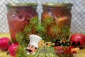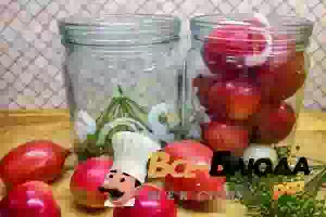 4. Несколько колец лука кладем на дно банки, вливаем масло и плотно укладываем помидоры, чередуя их с ранетками. Периодически для уплотнения встряхиваем банку. Последним слоем кладем нарезанный кольцами лук.