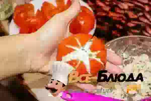 5. Томаты нафаршировать подготовленной начинкой. Подать закуску «Тюльпаны» из фаршированных помидоров с сыром и крабовых палочек на стол.