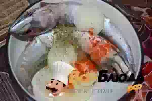 1. Для начала стоит определиться, на сколько человек рассчитано блюдо. Одной крупной скумбрии хватит на 2 взрослые порции. Тщательно чистим скумбрию, посыпаем специями. Луковицу нарезаем тонкими ломтиками и отправляем к рыбе. Ставим в холодильник мариноваться на полчаса.