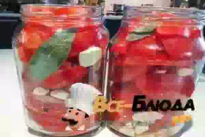 5. Горячие банки заполнить помидорами. Не забыть добавить в каждую банку чеснок, лавровый лист и горошины перца.