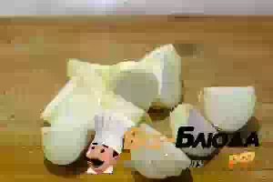 2. Луковицы чистим и разрезаем на несколько частей. С чеснока снимаем шелуху. Нарезаем зубчики тонкими пластинами.