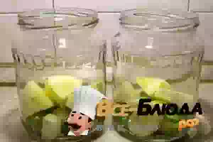 5. Банки слегка встряхиваем, утрамбовывая овощи. Выкладываем нарезку до самых краев банки. Подготавливаем маринад. В кастрюле доводим до кипения 1 л воды, выкладываем приправы, соль и сахар и кипятим 4-5 минут. В конце варки выливаем уксус. В банки с овощами осторожно выливаем кипящий маринад, прикрываем крышками и ставим в кастрюлю с горячей водой. Стерилизуем салат на минимальном огне в течение 20 минут с момента закипания воды. Плотно закрываем крышки, переворачиваем банки вверх дном и накрываем теплым покрывалом или полотенцем. Когда банки с салатом из зеленых помидоров с кабачками остынут, переносим их на хранение в сухое, прохладное место.