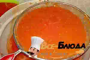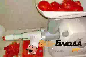 3. Подготовить насадку для выдавливания сока или просто мясорубку. С помощью насадки перекручиваем томаты. Помидоры очень быстро перерабатываются в сок и жмых. Если вы видите, что жмых не полностью отжат и в нём остался сок, прокрутите его ещё раз.
