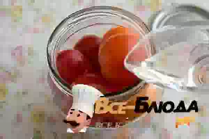 6. Наливаем в сотейник воду с солью и сахаром, ждем, когда она закипит. Переливаем кипящий маринад в банку с заготовкой.