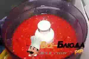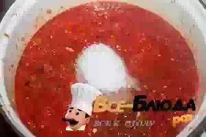 5. Перелить получившееся овощное пюре в кастрюльку. Прибавить сахар, крупную соль по вкусу, влить уксус и растительное масло. Размешать, разлить по банкам и убрать в холодильник. Дать постоять 1 час и можно пробовать. Сырая аджика из болгарского перца с помидорами готова.