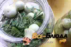 4. На дно банок, предварительно уже промытых и простерилизованных, выкладываю листья, немного хрена и укропа.