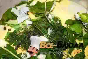 3. На дно посуды высыпать горчицу. Распределить её ровным слоем. Сверху насыпать слой зелени. Использовать для этого половину от взятого количества. Обязательно нужен укроп. Подойдет и зелень, и зонтики. Остальная зелень на выбор, можно взять обычный набор для засолки овощей. Добавить очищенный и порезанный чеснок.