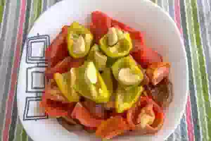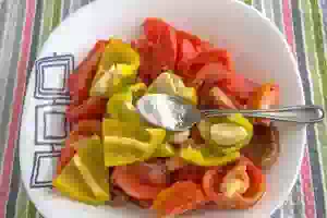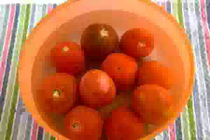 1. Подготавливаем спетые помидоры: выкладываем их в глубокую миску и заливаем овощи крутым кипятком. Через несколько минут сливаем воду и заливаем помидоры ледяной водой.