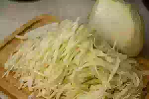 1. С кочана капусты удалить верхние листья. Разрезать кочан пополам и нашинковать, как вам больше нравится.