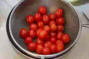 Помидоры черри вымыть под проточной холодной водой, откинуть на дуршлаг, чтобы стекла вода.