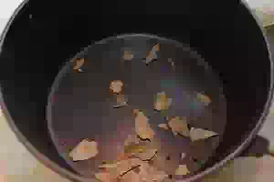 5. Приготовить рассол: в 500 мл холодной воды размешать соль и сахар. На дно трехлитровой банки или примерно такого же объема кастрюли положить лавровый лист, черный перец горошком и нарезанный лепестками очищенный чеснок.