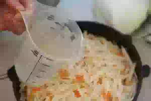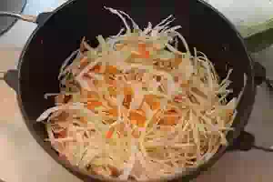 4. В кастрюлю пересыпать капусту и морковь. Мять руками не надо! Достаточно просто перемешать капусту с морковью.
