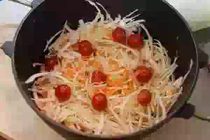 На неё уложить несколько помидорок. Накрыть помидоры следующим слоем капусты. Повторять слои из капусты и помидоров, пока оба продукта не закончатся. Верхним слоем должна быть капуста.