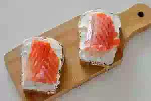 3. Слабосолёную сёмгу нарезать тонкими ломтиками и уложить на хлеб с сыром