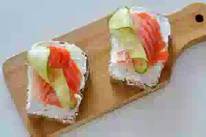 Брускетты со сливочным сыром, слабосолёной сёмгой и помидорами