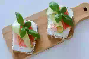 5. Вымыть и обсушить на бумажном полотенце базилик. Украсить листочками подготовленные брускетты и подавать на стол. Брускетты со сливочным сыром и соленой сёмгой подавать на стол, по желанию украсив помидорами черри.