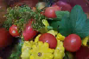 3. Стеклянную банку стерилизовать удобным для вас способом и заполнить овощами слоями - положить патиссоны, помидоры, зелень и лук. Залить кипятком, прикрыть банку ошпаренной крышкой и оставить на 15 минут. Спустя 15 минут воду слить в раковину.