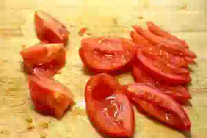 6. Последними в салатник добавить помидоры. Желательно удалить из помидоров семена и нарезать полосками шкурки.