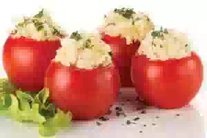 Фаршированные помидоры. Помидоры красные могут украшением стола стать при торжестве любом. Кроме того, входят томаты в качестве ингредиентов не спроста в многие блюда, ведь полезны они, малокалорийны и вкусны. Томаты старение предотвращают и от рака кожи защищают простаты, оказывают эффект положительный при заболеваниях сосудов и сердца. Такое действие содержащимся ликопином в них объясняется. При обработке тепловой концентрация его в блюде увеличивается только.