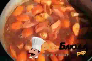 2. Выкладываем в глубокую сковороду, смазанную маслом для жарки. Доливаем около стакана воды. Тушим под крышкой. Помидоры должны пустить сок, поэтому чересчур много воды добавлять не стоит, стакана вполне хватит.