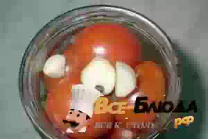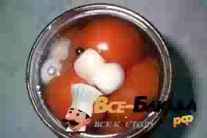 5. После второго раза сливаем воду и выкладываем на помидоры чеснок и черный перец горошком, добавляем сахар и соль, вливаем уксус.