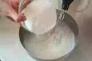 1. Яйца вымыть, разделить на желтки и белки. Белки перелить в миску для замеса теста, взбивать миксером на невысокой скорости до получения мягкой пены. Продолжать взбивать, добавляя частями сахар.