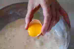 3. Не выключая миксер, добавляйте по одному желтки.