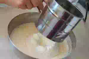 4. Когда смесь снова загустеет, всыпать просеянную муку. Перемешать лопаткой или ложкой, чтобы получилось однородное воздушное тесто.