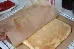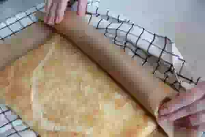 7. Приподнимая край полотенца, свернуть горячий корж в рулет вместе с новым пергаментом. В таком виде оставить на столе, чтобы тесто остыло.