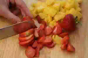 8. Пока остывает корж, подготовить ягоды и фрукты для начинки. У меня были клубника и манго. Клубнику нарезать кубиками или пластинами (оставить несколько ягод для украшения). Мякоть манго отделить от косточки, как описано в этом рецепте, а затем нарезать её маленькими кубиками.
