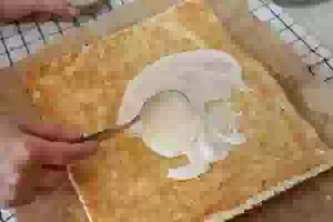 9. Пока корж будет остывать, приготовьте крем. У меня был десертный крем из рикотты со сгущенкой и взбитыми сливками. Подробный рецепт смотрите здесь. Когда рулет остынет, аккуратно его развернуть, удаляя бумагу. Обрезать неровные края, если есть такая необходимость. Смазать корж кремом, равномерно распределяя его ложкой или лопаткой.