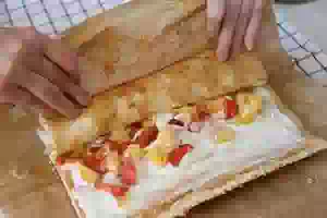 11. Свернуть рулет с кремом и ягодами, но уже без бумаги. Для удобства немного приподнимайте бумагу и придавливайте рулет, чтобы он получился плотнее. Переложить готовый рулет на плоскую тарелку и убрать в холодильник хотя бы на полчаса, чтобы крем загустел, рулет пропитался и стал еще нежнее. Перед подачей можно обрезать края, чтобы придать бисквитному рулету аккуратный вид, украсить сахарной пудрой или кокосовой стружкой. Сверху можно разложить нарезанную ломтиками клубнику. Бисквитный рулет с кремом из риккоты, сгущенки и взбитых сливок, дополненный клубникой и манго, готов.