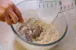 1. Подготовить просеянную пшеничную и льняную муку. Сначала в миску просеять пшеничную муку, затем - льняную. Отруби, оставшиеся в сите от льняной муки, тоже пересыпать в миску. Туда же отправить сухие дрожжи и сахар, перемешать с мукой.