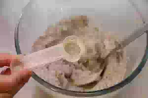 4. Следом - ложку растительного масла. Начать месить тесто. Сначала можно делать это ложкой, затем - руками. Пока вымешиваете тесто, подсыпать ложку молотой зиры (кумина).