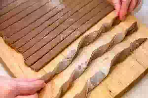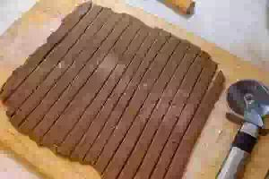 8. Разрезать тесто на полоски шириной 1.5-2 см. Удобнее делать это ножом для пиццы.