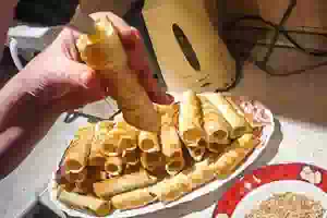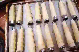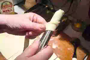 1. Пакет замороженного слоеного теста разделить на пластины и разморозить, раскатать на доске и колесиком для пиццы (очень удобно!) разрезать на полоски шириной 1,5-2 см, длиной около 25 см. Аккуратно накрутить тесто на трубочки, прижать нижний конец, чтобы не раскручивалось. Из одного пакета на 500 г теста – примерно 25 штук.