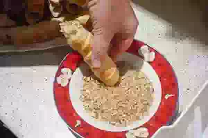 4. Приготовить крем. Можно – просто заварной. На 2 стакана молока – 3 яйца, 1,5 стакана сахара, 3 столовые ложки муки – все заварить, остудить, вбить 200 г сливочного масла. Можно – с вареным сгущенным молоком – на 1 банку молока – 250 г сливочного масла. Остывшие трубочки наполнить кремом из мешка с насадкой, выглядывающий из трубочек крем окунуть в измельченные скалкой орехи, трубочки сложить в коробку и охладить.