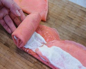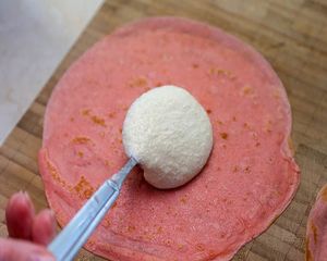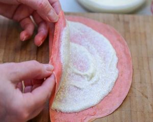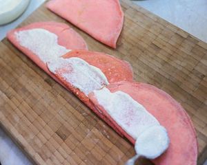 3. Сложить блин пополам кремом внутрь. Для формовки небольшого тортика будет достаточно 10 розовых блинов с начинкой.