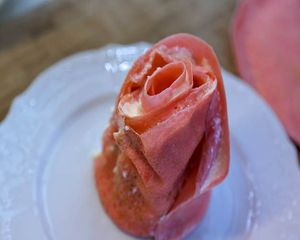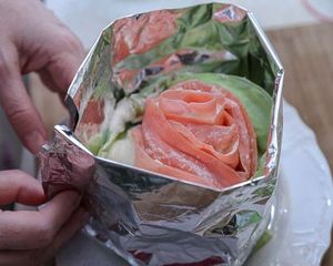 12. Снять с торта фольгу, немного отогнуть кончики блинов от центра, чтобы придать торту форму раскрывающегося розового бутона. Блинный торт «Роза» готов к подаче. Его легко разрезать ножом на порции.