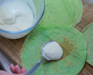 8. Дальше будем оформлять розовый блинный торт зелеными блинами, имитируя зеленые чашелистики. В центр зеленого блина выложить крем, распределить по поверхности, оставляя свободными края примерно 2 см. Сложить блин пополам. То же самое проделать еще с 2-3 зелеными блинами.