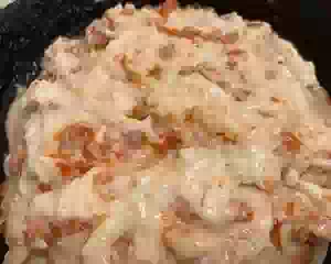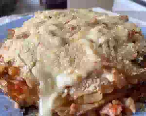 Блинный мясной пирог с сыром моцарелла и соусом бешамель