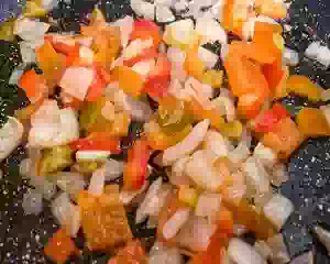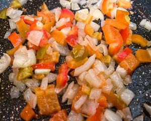 4. Обжарить рубленый лук до прозрачности. К луку добавить нарезанный кубиками сладкий перец (если в запасах есть замороженный перец, то берите его). Обжаривать, помешивая, около 5 минут.