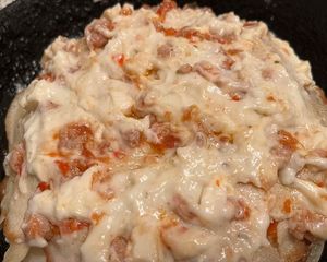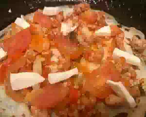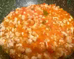 5. К овощной пассеровке добавить мясной фарш и жарить, помешивая, еще минут 5. Прибавить томатный соус и тушить под крышкой 15 минут на медленном огне. Начинка готова. Отдельно приготовить соус бешамель.